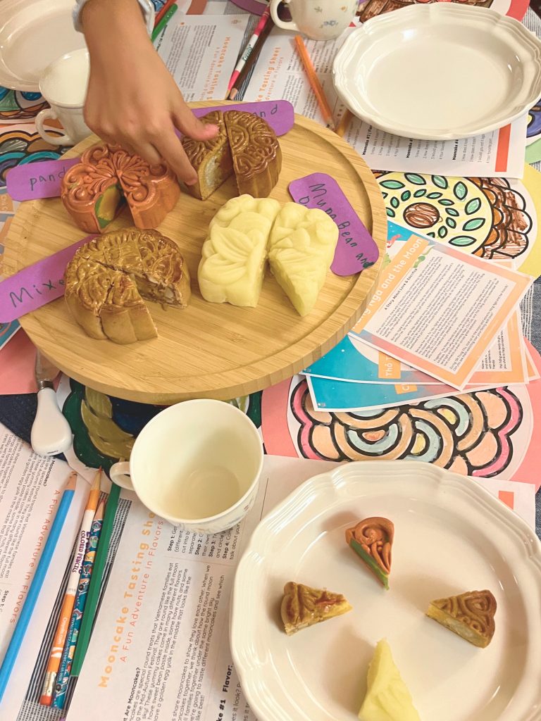 How It Works: Get 3-4 different mooncakes (from anywhere—Asian markets, Vietnamese bakeries, or Costco if they’re available there). Let kids observe, taste, and rate them. What do they see? How does it taste? Would they eat it again?